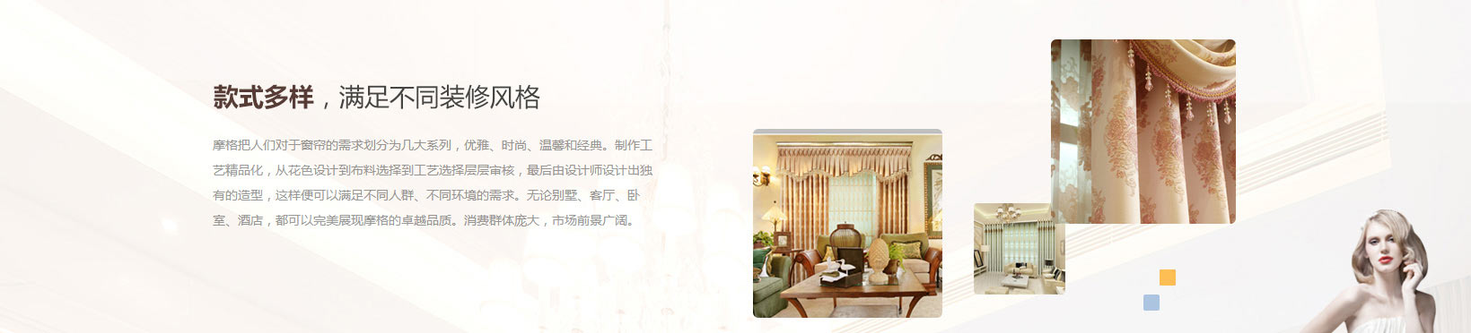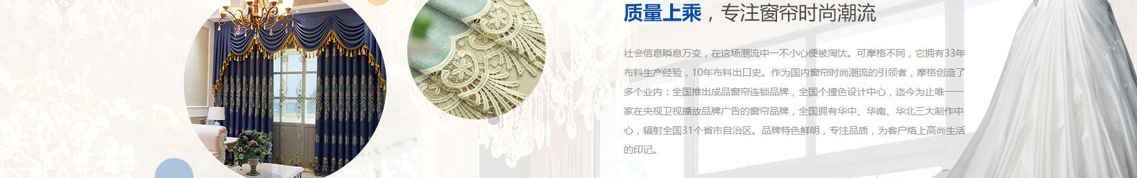 取源于中華悠久紡織文化的摩格(MOONGOOL)品牌,始終堅持“健康、時尚、精致”的產(chǎn)品觀,引領(lǐng)軟裝布藝行業(yè)進(jìn)入高品質(zhì)生活。產(chǎn)品設(shè)計風(fēng)格融入歐式低調(diào)奢華元素及國際流行時尚趨勢,先后開發(fā)了古典巴洛克、簡約洛可可、經(jīng)典中式(新中式)、時尚地中海、浪漫田園、唯美美式、原木風(fēng)、奶油風(fēng)、現(xiàn)代簡約風(fēng)九大風(fēng)格系列產(chǎn)品,擁有各種花型、工藝、材料面料達(dá)1500余種。其中窗簾產(chǎn)品作為摩格核心產(chǎn)品頗受消費者青睞。采用高精密、棉麻、雪尼爾等上千種布料的摩格窗簾用高端的新興工藝制作,絨面柔軟,織物華麗,九大截然不同的風(fēng)格同時搭配種類繁多的布類花型和不同的制造工藝,顏色或艷麗或素雅或大氣,簡約而不簡單。無論哪一款窗簾,都在注解不一樣的故事,也詮釋著自己的絕佳格調(diào)。正因為如此,個性獨特和創(chuàng)新思維賦予摩格更多的市場商機。